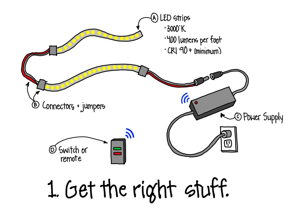 Getting the right strips should not be hard. Kits are ubiquitous online and in big box retailers. On our specification side we use products from American Lighting, WAC, DiodeLED, and other high quality solutions that are a bit difficult to source on your own. Check out suppliers like SolidApollo for strips, kits, and all the parts needed set up for easy-to-use online shopping. Check the image above for suggested metrics to get good quality strips. Make sure to include power supplies and a convenient method of turning the strips on and off.