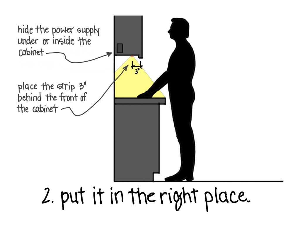 You’ll also need to hide the power supplies and make sure there is a receptacle nearby for plugging in. Power supplies are often small enough to tuck into the space underneath the upper cabinet, just be sure to place them towards the back so they do not cause shadows from the strips. If you have a small drill bit and own the cabinets, a cleaner look is to place the power supply inside a cabinet and run wires from there.