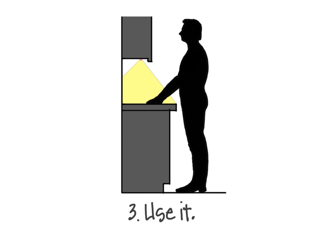 Duh. Just make sure to use the light once you have it. Once you get used to LED strips on your kitchen counters, you won’t want to give it up. The result should be good strong even illumination like in the photo below. Chances are high that you may end up using these lights more than any other in your kitchen. Why? Because it is the right light in the right place. That’s lighting design.