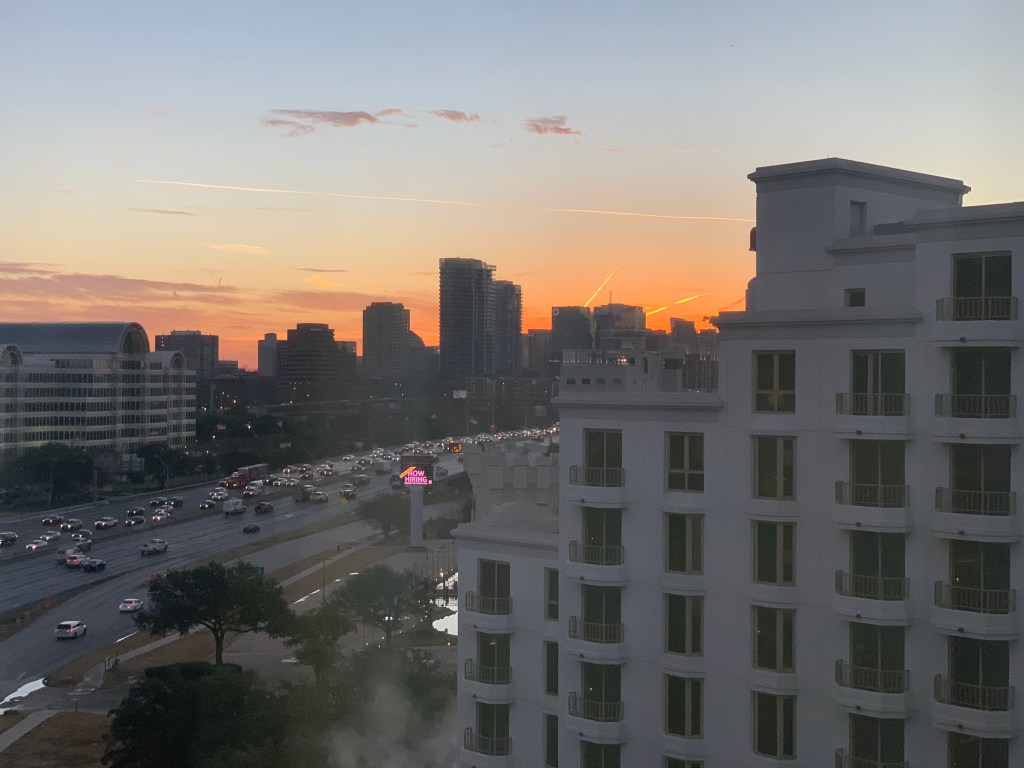 A recent sunrise from my hotel room in Dallas has it all: cool blue skies, warm glow on the horizon, and sparkle from clouds and electric light.