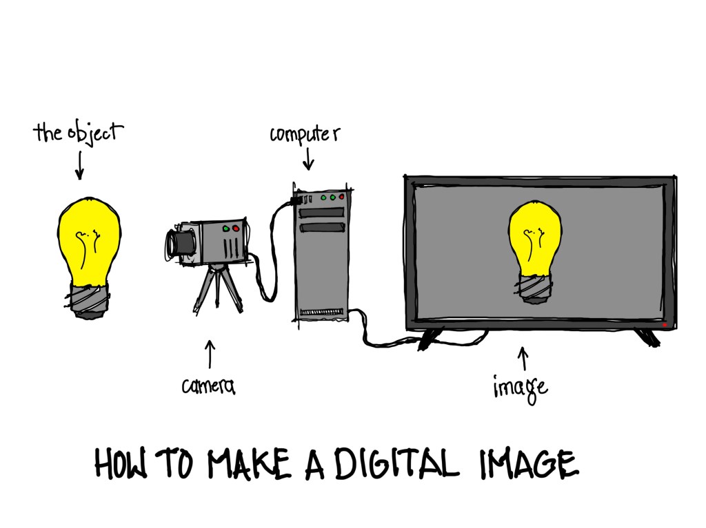 Here’s where it gets fun. By changing a tiny bit of code in the computer, I can make the light bulb look different on the screen. Call it photoshopping, image processing, editing, or whatever you like, but the sketch above is meant to illustrate a simple concept: what is seen on the monitor is influenced by both the original object itself and the computer’s internal processing code.