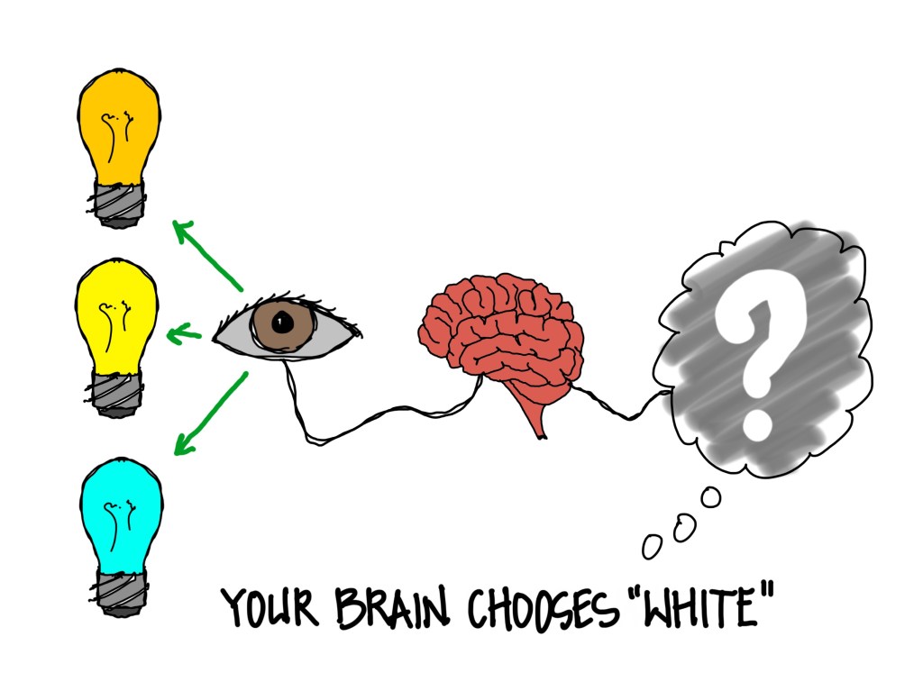 Our brains have an internal function you could call “white balance” that constantly evaluates all the incoming visual imagery to identify “white.” Once our brain decides which of the many incoming signals is “white,” our brain will white balance and shift our perception of everything else. In other words, white light is relative to what is around it.