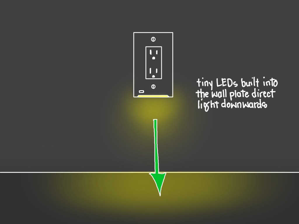 This approach was taken one step further by a company that embedded tiny LEDs into the wall plate itself, casting light down where needed and with the added benefit of freeing up both plugs (for some unknown reason, despite being able to put supercomputers into our wrist watches, we can’t seem to build many nightlights that don’t block both plugs on a receptacle). I have never used these myself, perhaps because I’m lazy, but it seems like a pretty good idea to me.