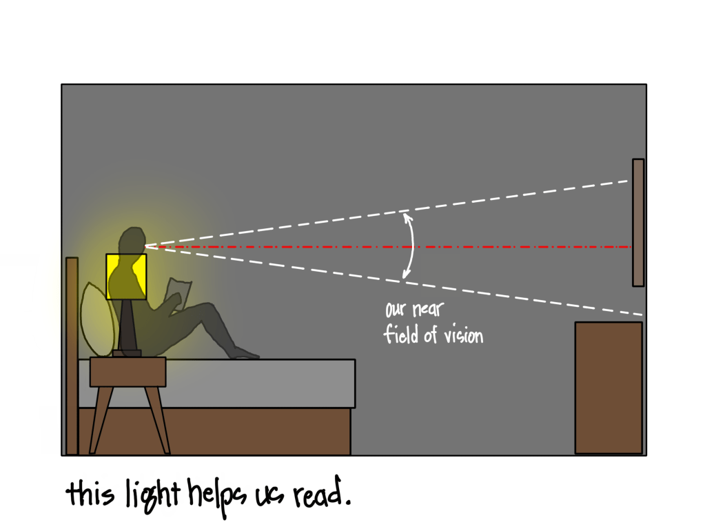 But there is another, perhaps better, reason to add an accent lamp to your bedroom: because you are human. And because you are human, you probably have eyes. Those eyes have a narrow field of vision, about twenty-five degrees wide, where you see in focus. In a bedroom with only bedside lamps, that area can be very dark, leading to less-than-comfortable feelings as you wake or prepare for sleep. Chasing those shadows away can be done by wall-washing or accent light on art from recessed lights, but that would require an electrician if they aren’t already in the ceiling.