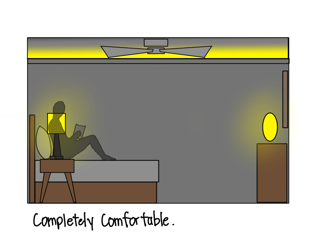 Need another idea? Start with bedside lamps, preferably something shaded to minimize glare and sleep disruption. If you have a reading chair in your bedroom, how about a floor lamp? Got a plant in a corner? A floor-mounted uplight casts great patterned shadows on the ceiling. And a good indirect light – like the cove light shown here – can round out the light for a very comfortable evening.