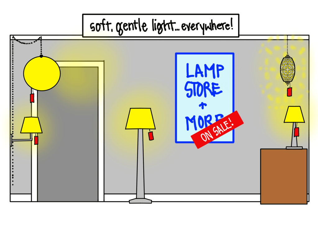 Kids need light everywhere, soft and gentle on the eyes, with as few deep dark shadows as possible. Walk into the lighting aisle or store and you’ll find just that- soft, gentle light everywhere.
