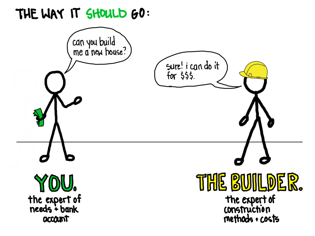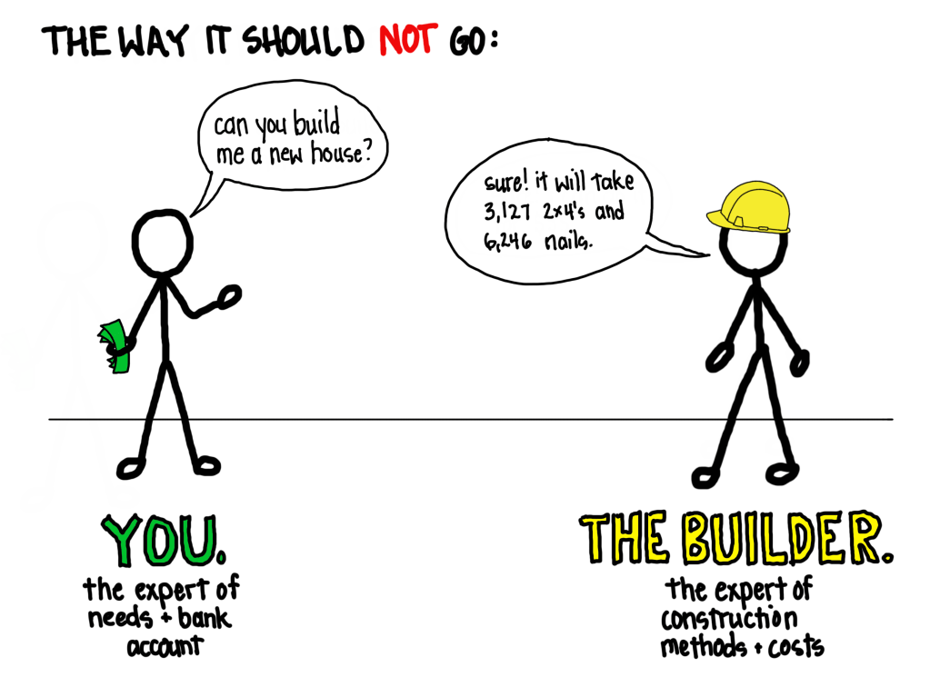 A better budget approach- and fortunately the common approach- is for a builder to provide an estimate of the total cost for a new home. The client can look at the number (and not be distracted by the quantity of 2×4’s) and determine whether or not it fits their budget.