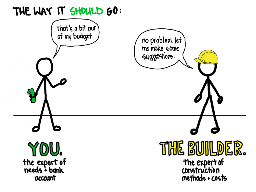 If the budget is more than the client wants to spend, they can ask the builder how to save some money. The builder then recommends ways to cut costs such as building smaller, trimming finishing material costs, or letting go of that second fireplace in the master bedroom.