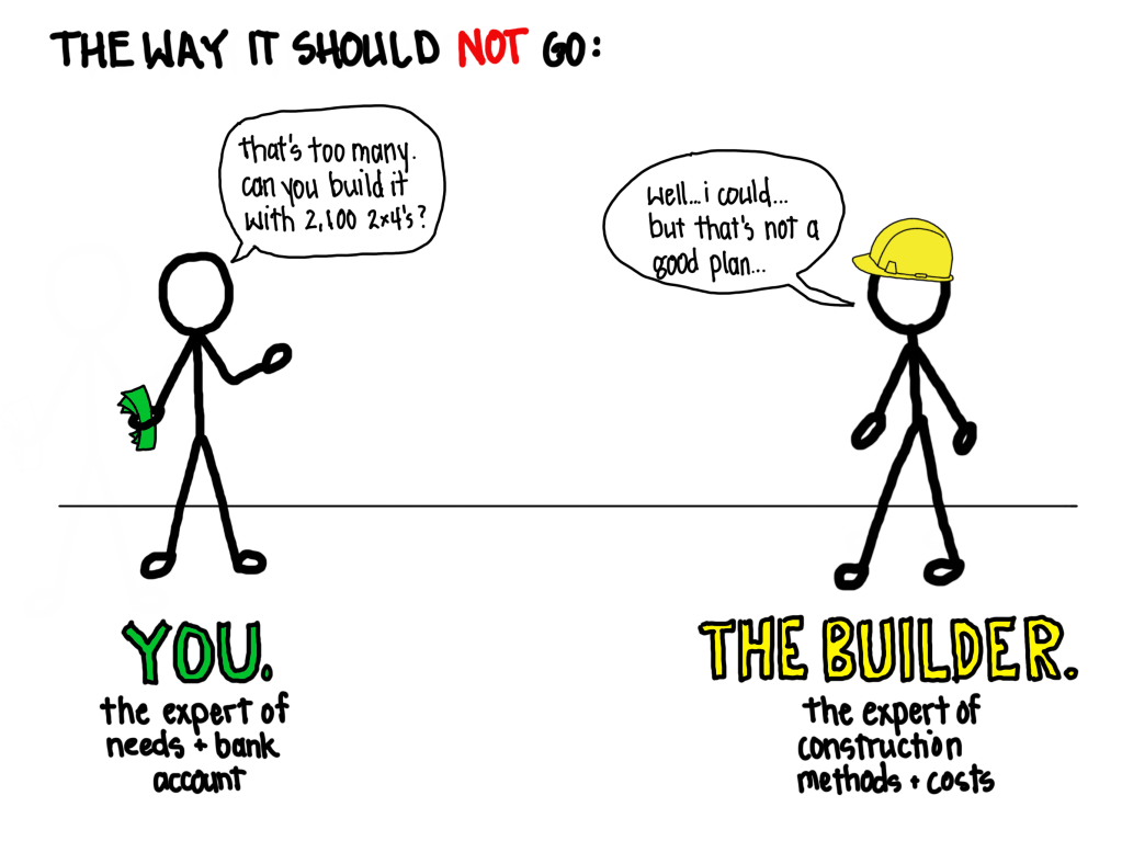 Quite simply, there are very few clients out there who can look at a quantity of lumber and determine whether or not it will build what they want and be safe, functional, and beautiful. I certainly could not. But that doesn’t stop some of us from trying to become the framing expert, so to speak, and suggest the builder do with less.