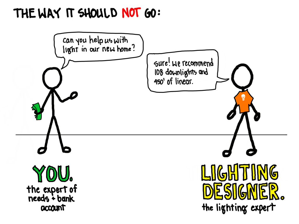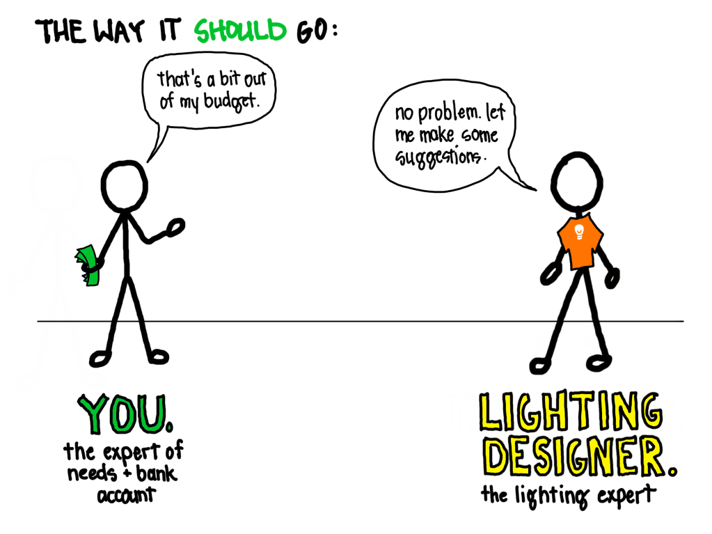 So let’s imagine the conversation again, this time with a lighting designer instead of a builder. The client asks for help with lighting, and the designer provides a quantity of fixtures and a budget price.