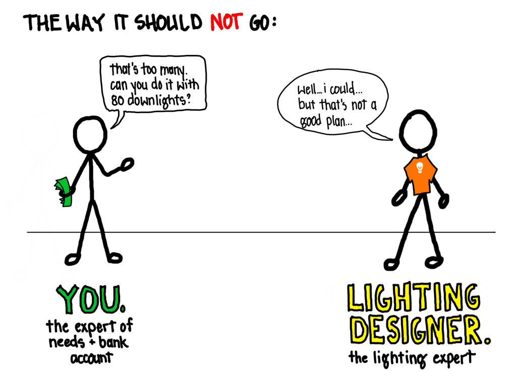It is worth mentioning that lighting designers are often consultants to architects or collaborators with interior designers and builders. In this case, the builder or designer may also play the role of the client. “I need you to cut 20% of the downlights, there are too many.”