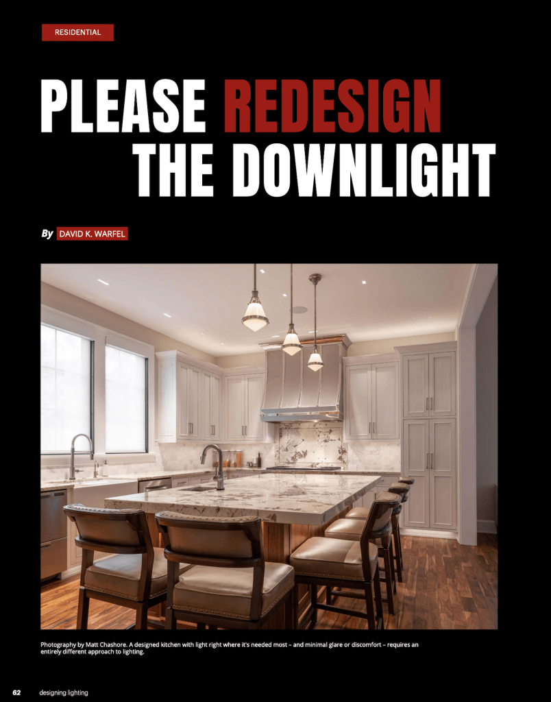 In the October issue of Designing Lighting, I appeal to the lighting industry to redesign the downlight. There are some amazing downlights made – and none of them are compatible with any other. We – the industry – are creating a potential mess for our consumers down the road, and this is especially true in the residential market. I do not want to return to the days of halogen incandescent, even though I loved the MR16, but I do want us to do better at interoperability and standards. Let me know what you think!