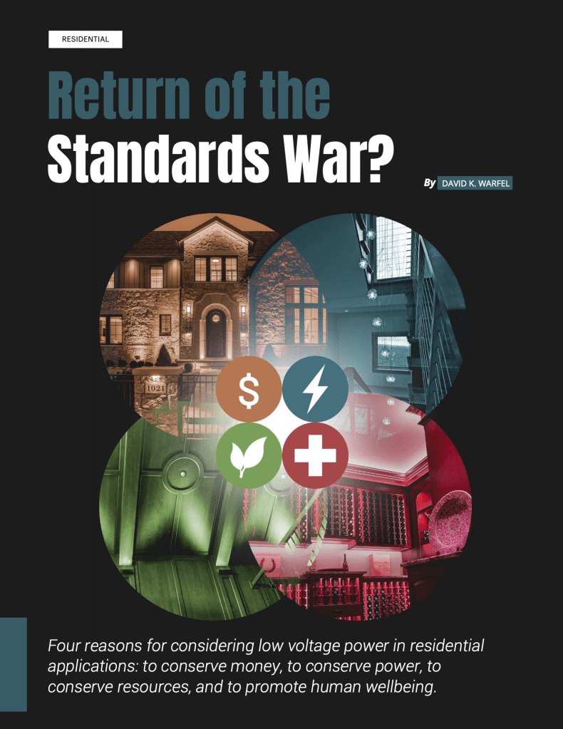 The third article in my series on Lighting Hope is out in Designing Lighting! I learned a few things writing this article about the future of power that surprised me, particularly that my focus on low voltage lighting may be suitable for the near future…but there could be something even more revolutionary ahead. Digital power could revolutionize how we wire homes, but will it lead to another standards battle?