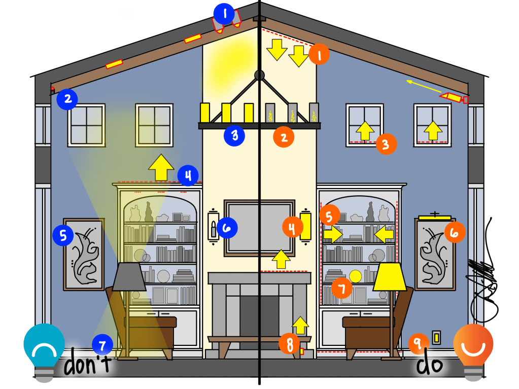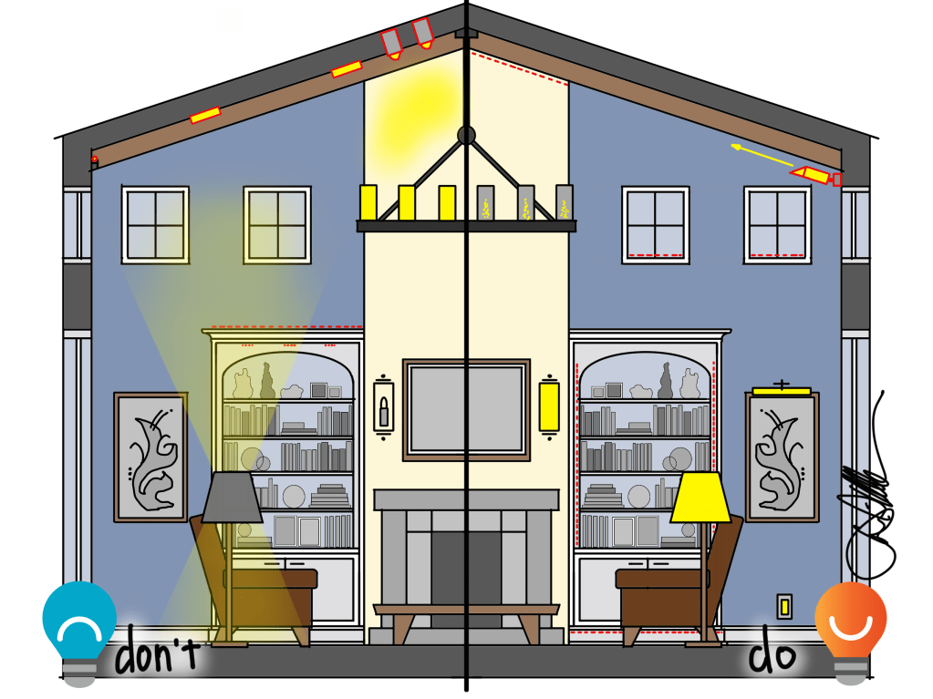 - Dark Arts. Too many living spaces are illuminated with a decorative fixture and downlights that illuminate the ceiling and the floor while leaving the walls the darkest surface of the room. This is exactly the opposite of what will make us feel comfortable – the walls should be the brightest, the floors second, and the ceiling third. Our eyes want light ahead of us, on the walls, and that also makes our art, photographs, finishes, and more look their best.