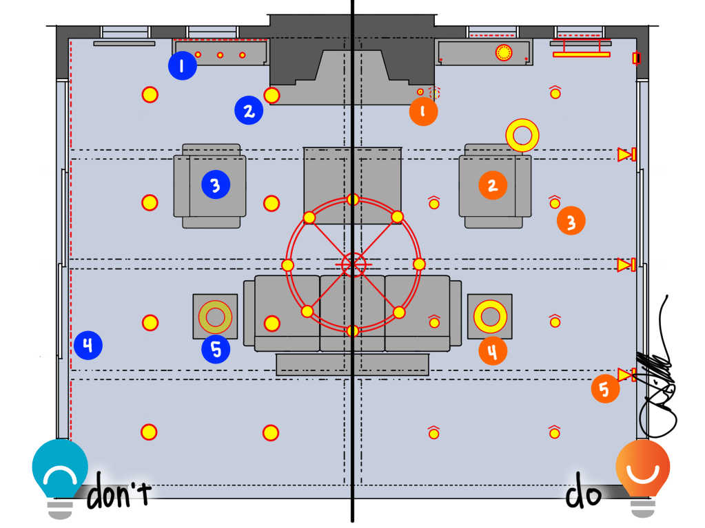 Let’s start with a section view of this living/great room. What are the Don’ts we see all too often on electrical plans?
