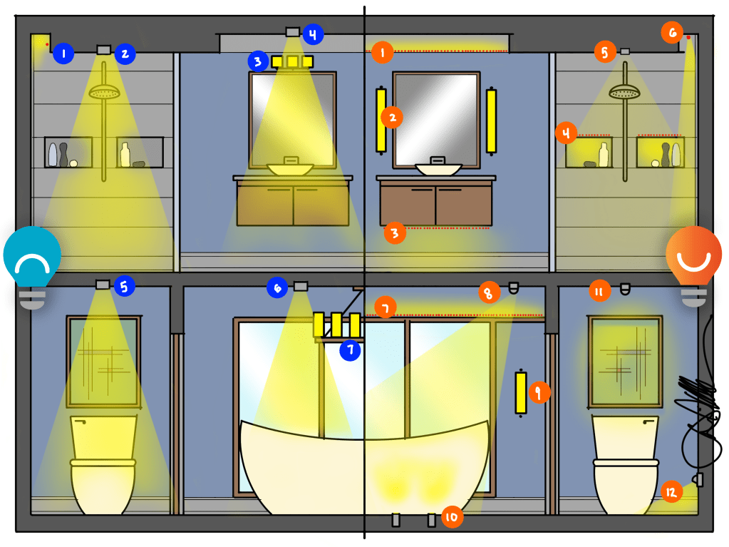 - Downlights in the shower. Yes, I said don’t do this above, but the real story is that doing only a recessed downlight in the shower is not great. Adding a few recessed downlights, highly shielded (not bright to the eye), can be very beneficial as part of a complete strategy. This may be tough to believe, but I do not have a vendetta against downlights. I have a vendetta against homes only illuminated with downlights.