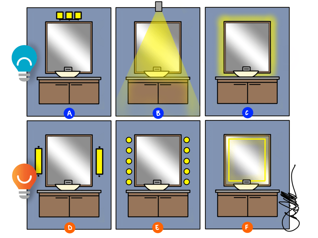 - Illuminated mirrors. Mirrors with built-in light sources can provide a decent amount of soft light to fill in the shadows, though their recessed nature makes them a little less ideal than D and E.