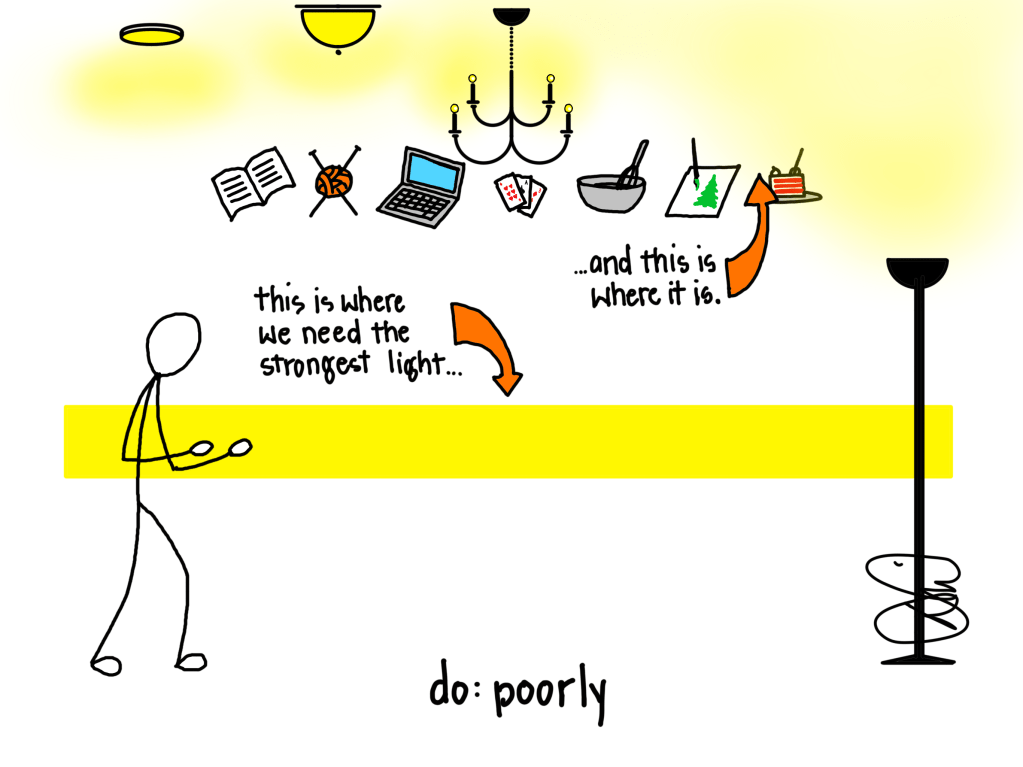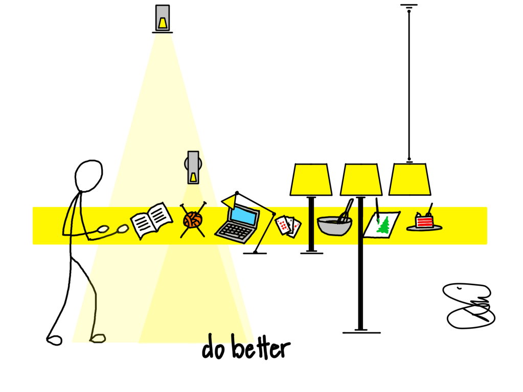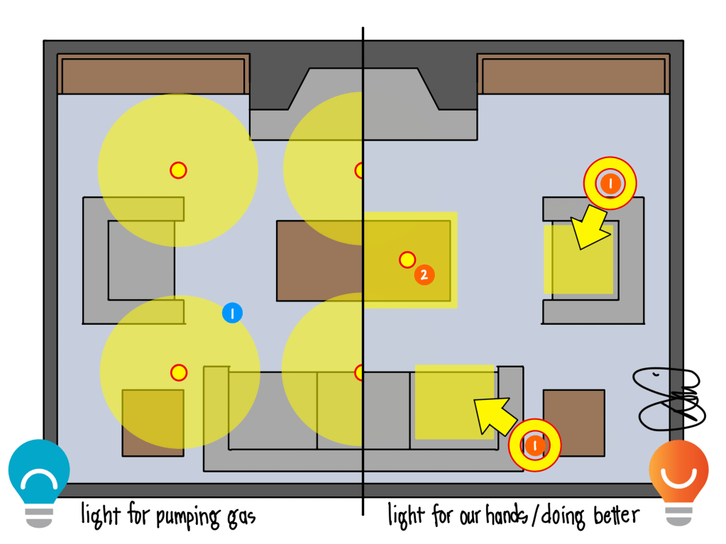 Light for our hands can help us do better- when it is in the right place for our hands. In the simple diagram of a living room above, light for our hands needs to be in the middle of each seat for reading and knitting and on the coffee table for board games and snacks. This might come from a recessed downlight over the coffee table, but lamps can be better for reading and crafting. The lighting plan is completely different, but much more effective.