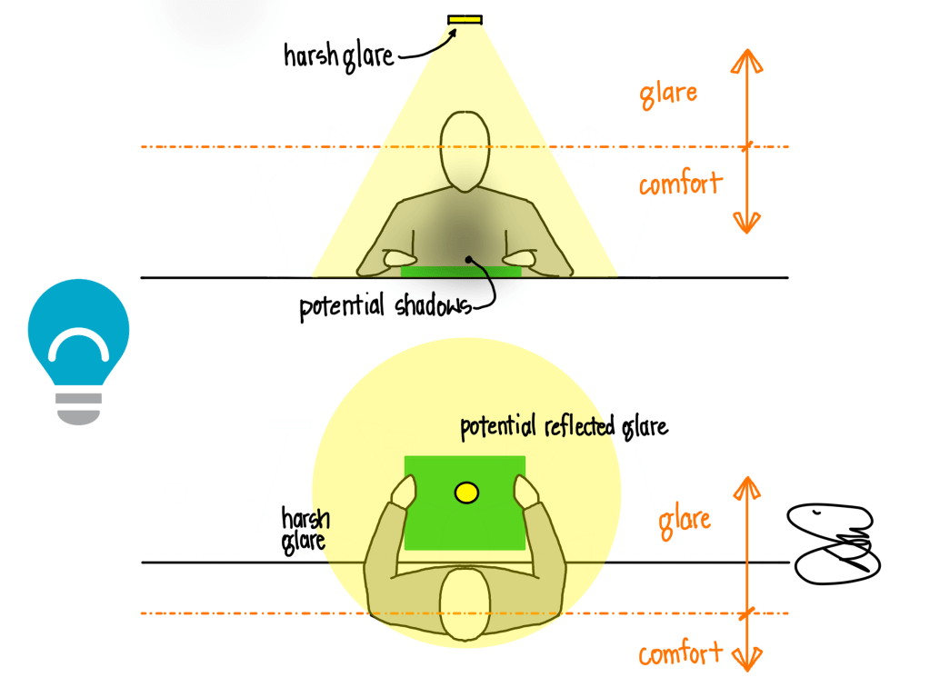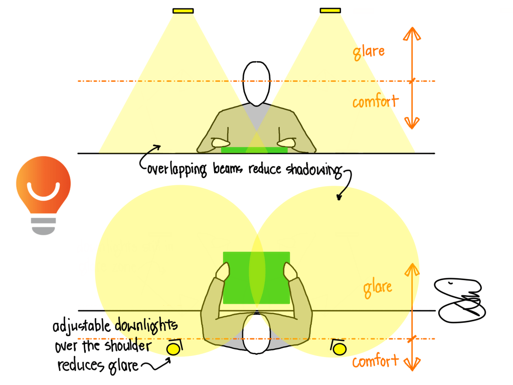 Nudging the fixtures behind the shoulders of the individual and aiming them back at the work surface can trim down a bit of the glare. This must be done carefully to minimize shadows from our bodies, but can be much more comfortable. This is how I like to approach lighting a bathtub that is used for soaking and reading; the light is safely away from the water and over the shoulder, reducing harmful glare. This geometry works so long as the person will sit in only one place (like a tub), but anywhere there is flexibility this idea can break down.