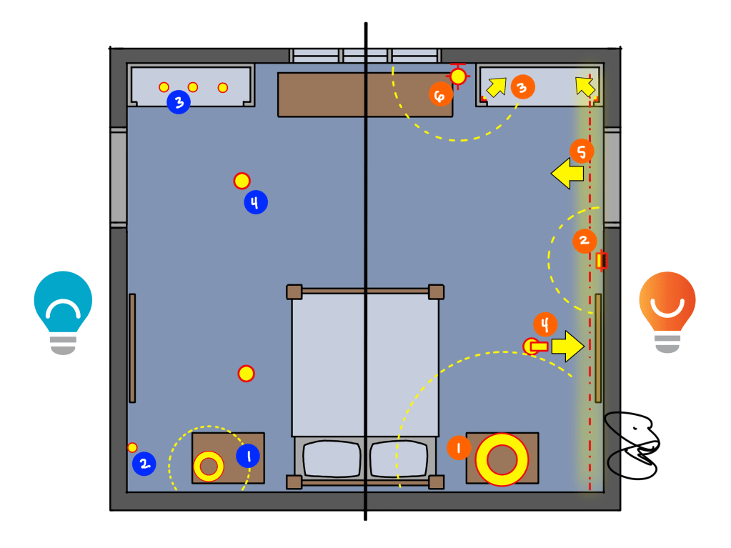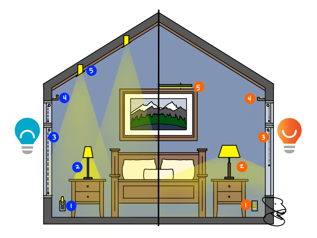 - Light the walls. This applies to every room in the house, not just the bedroom. Our “comfort zone” is what we see in front of us, and that should be softly illuminated. Art, furnishings, curtains, walls: all should be illuminated if we want to feel good. A side effect is that the room looks better, too.