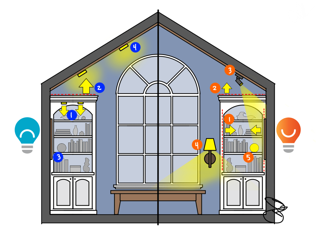 - Point it away. This may be the one rule to, er, rule them all: point lights away from your eyes. From puck lights inside shelves and cabinets that shine at your face to downlights do the same, we will be most comfortable when lights shine away from us and bounce of something else like artwork, walls, books, or ceilings.