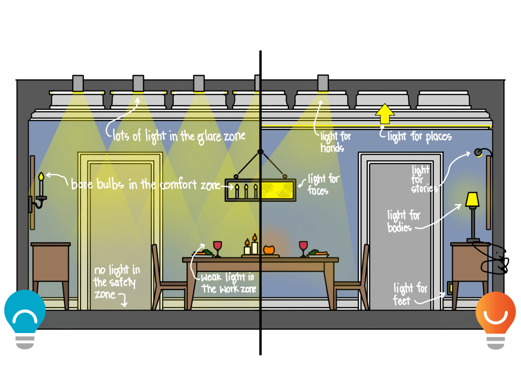 - Beware of Glare. We have a Glare Zone in our field of vision directly above us, a place where bright downlights, disc lights, or other fixtures can cause the most discomfort. Our eyes are sunken back under a brow to help prevent that light from reaching us, but indoors it is all too easy to pack the glare zone with lights that hurt us. Avoid grids of recessed downlights pointing at the floor in a dining room; the glare they produce will detract from your experience.