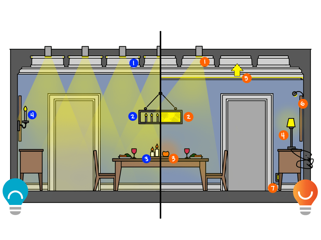 - Focus on Food. Use carefully placed recessed adjustable (aimable) downlights to push light to the table, making it the brightest place in the room while keeping chandeliers dimmed. This will create balance that makes everything better.