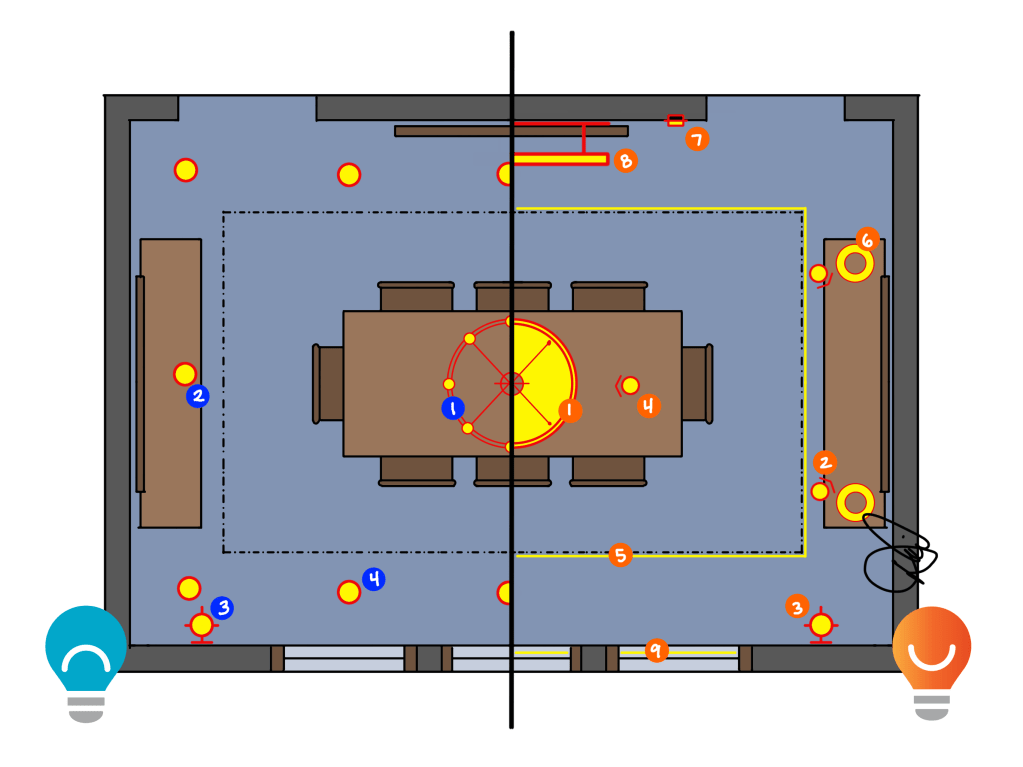 - Weak does not Work. Even with our hands is a Work Zone that needs to be strongly illuminated. In a dining room, this zone is usually at the table top where our food and drink live. Too many beautiful chandeliers leave the Work Zone weakly illuminated, often pushing more light up than down. If you turn on all the lights and the table top is not brighter than your ceiling, you have weak light in the Work Zone.