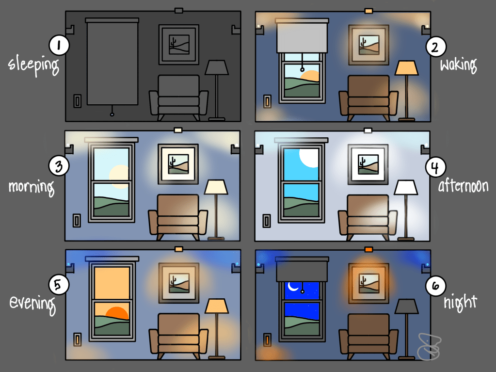 - Morning. Light can brighten and begin cooling off to energize our mornings, and light shifts to more overhead and walls to mimic the brightening sky.