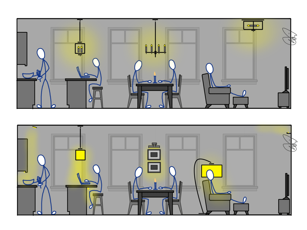 I could not figure out how to communicate, in a single static sketch, actual change. Perhaps I could make little video, a GIF, that shows the kitchen lights going off for dinner and coming back on, but much lower, for an after-dinner drink. Maybe I could illustrate the kitchen island with changing light for daytime cooking and evening relaxing. Maybe I could show multiple layers of light in the dining area being used to create a quiet dinner or a rowdy atmosphere for board games. Lights in the living room could click off when the book is put down, perhaps dimming gently towards bedtime to prevent melatonin suppression. If you have an idea on how to illustrate the necessity of changing light, let me know.