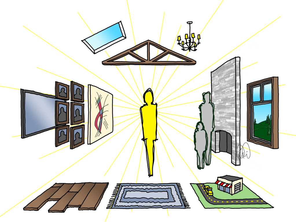 We are surrounded, when we are in our homes, by choices that reflect our values and tell our stories. We are surrounded by the faces of loved ones, in person and in photos. We walk on floors and rugs and sidestep toys under our feet. Beams, trusses, light fixtures, and skylights hang over us. Stone fireplaces, artwork, televisions, and windows with great views surround us. Could I learn something about you by sitting for a moment in your home?