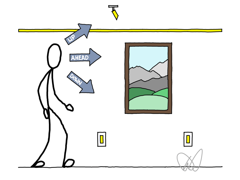 Up ahead of us, in our near field of vision, is an area I like to call the comfort zone. This is where our eyes naturally and comfortably rest, and so much of the beauty we perceive is in this zone. It is here that we gaze into the eyes of a loved one, where we see out the window to a beautiful sunset, where we admire art on a wall, where we watch television…it is, in other words, the most important place to have good lighting.