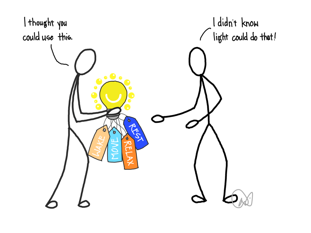 Later on, I will dig into how light can help us move with more energy, focus clearly on our tasks, perhaps even boost our memory and test scores. Our body responds to light with alertness and cognition and a host of other biological processes, but only when our body gets the right light. As you can guess, Ashleigh spends a lot of their time inside their home, at the hospital, and in the car in between. They are not getting the light they need during the day. Not by a long shot.