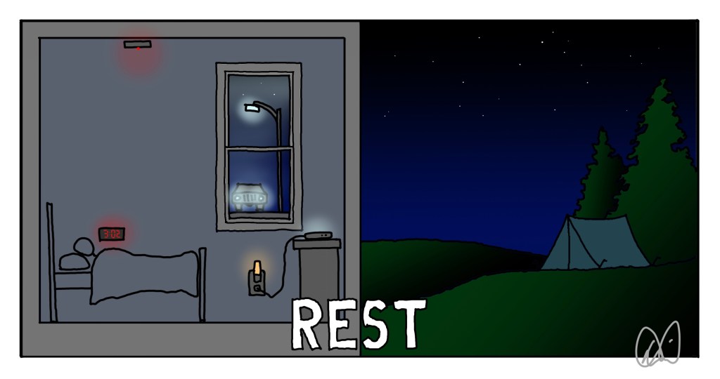 As evening begins, our bodies need signals from light to begin the long wind-down towards sleep. Too often our imaginary reader, Ashleigh, leaves the lights on until it is time to sleep. Sudden darkness does not lead to sudden rest. Our first response will be more like panic, and we had enough of that from our alarm clocks already. Sit around a campfire in the woods and you will soon be ready for bed. Why can’t we have that feeling at home, indoors?