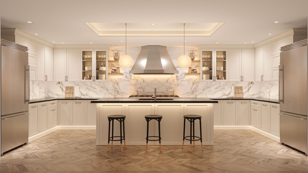 No cove? No problem. We sometimes use a built-up cove added to a flat ceiling to bring soft indirect light into otherwise plain kitchens, as shown in this concept rendering. It also makes a great design element, like putting a carpet underneath a seating area to draw focus and create boundaries.
