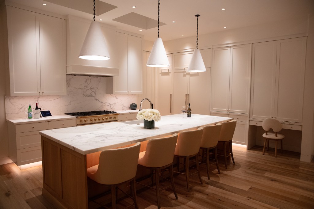 The interior designer on this project chose lovely pendants with a solid shade that blocks light from emitting sideways, where we need soft light for the faces of those standing around us. The pendants do a better job than most sending light downwards towards the countertops, but more was needed. Jessica Doyle, one of our talented Senior Designers, added a double row of downlights that push light to the island top and also softly illuminate the outsides of the pendant shades, resulting in a nicely balanced look.