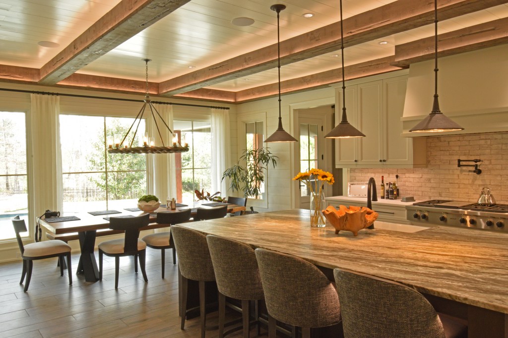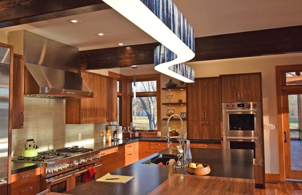 There is more than one way to light a ceiling, as this kitchen illustrates. We added tiny strips of light to each side of the beam, at the bottom, to direct light upwards onto the tongue-and-groove ceiling. The result is glare-free, shadow-free illumination throughout.