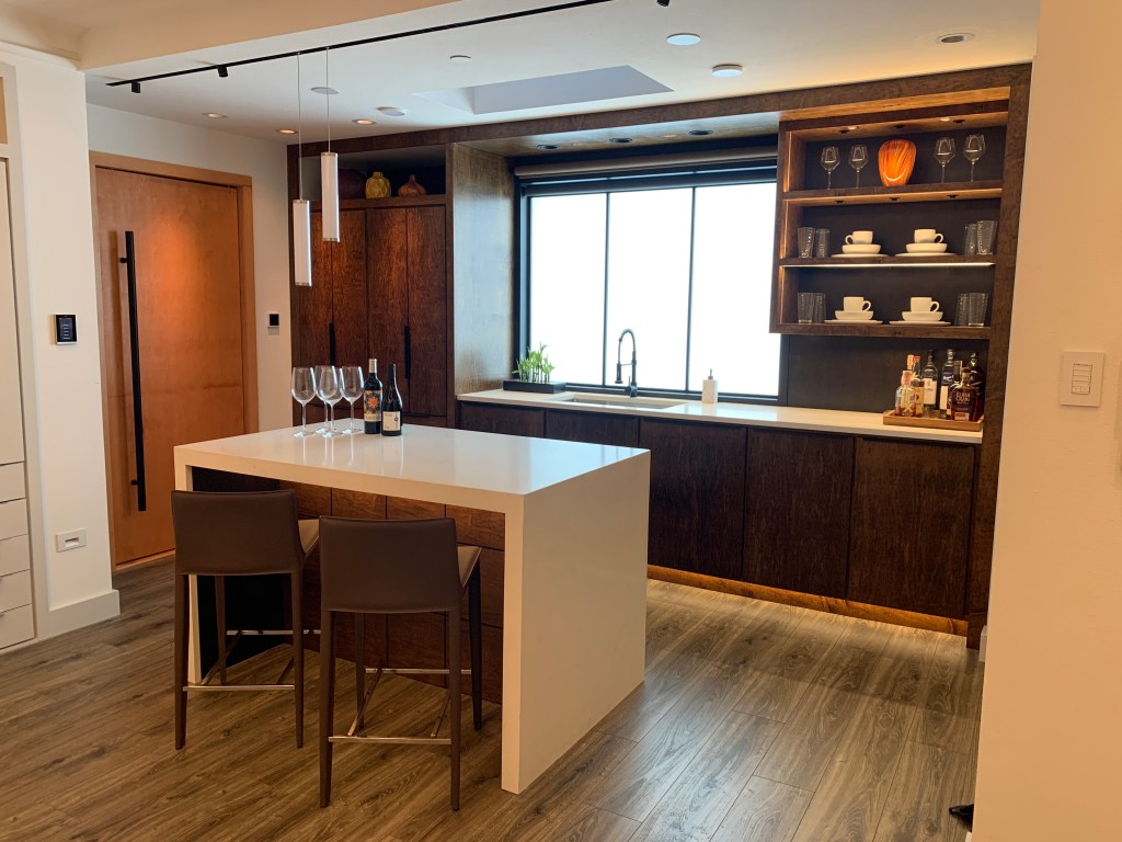 - The safety zone is carefully lit with toe-kick lighting and under-bar lighting.