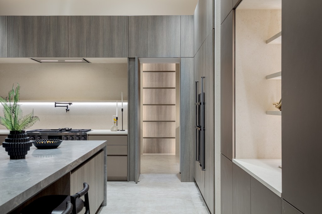 Embedding a strip of light into a floating spice shelf above the cooktop brought functional light down below eye level, delivering better light with less glare in this modern kitchen designed by Senior Designer Kelli Hernandez. (Photo credit to VistaSerenaShowhouse.com)
