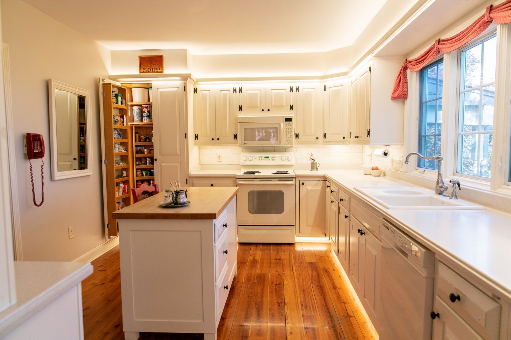 We experimented with linear lighting in this modest, traditional farmhouse kitchen, completely eliminating the need for recessed downlighting. Note the strong glow on the cabinet fronts, the well-lit countertops, and the indirect cove light concealed by trim. Even the pantry has linear lighting running vertically inside the face frame.