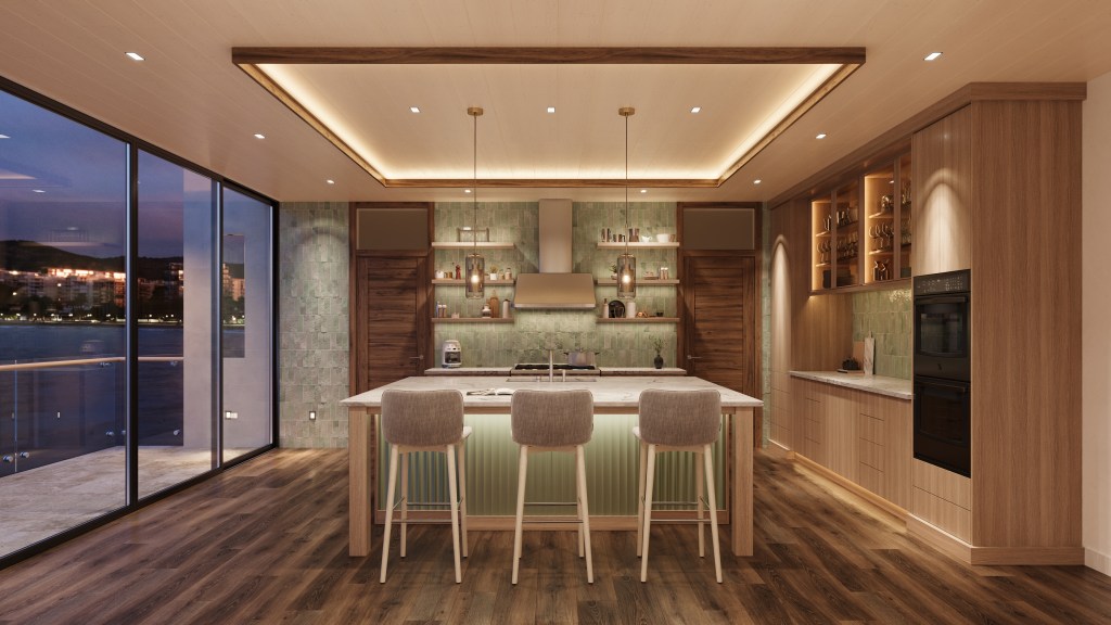 - The work zone is well illuminated with linear undercabinet countertop lighting, pendants with a downward component, and additional downlights over the island.
