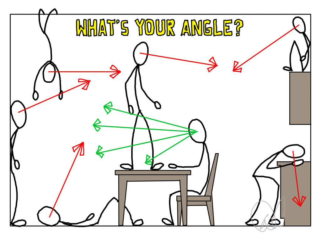 Our viewing angle – the direction our eyes are facing at any given moment – changes constantly, but we also tend to land in generally the same places over and over again. In our living room, I am always on the right side of the couch as seen from the door. In the dining room, I am always in the chair on the end of the table between the northern facing window and the door to the kitchen. In my home office, I always sit facing my computer monitor.