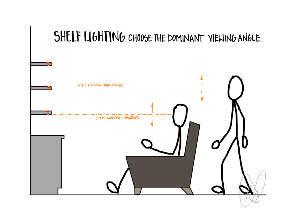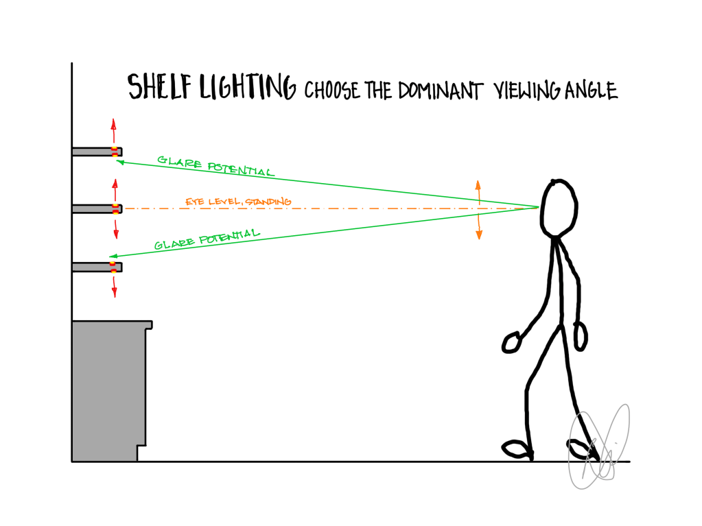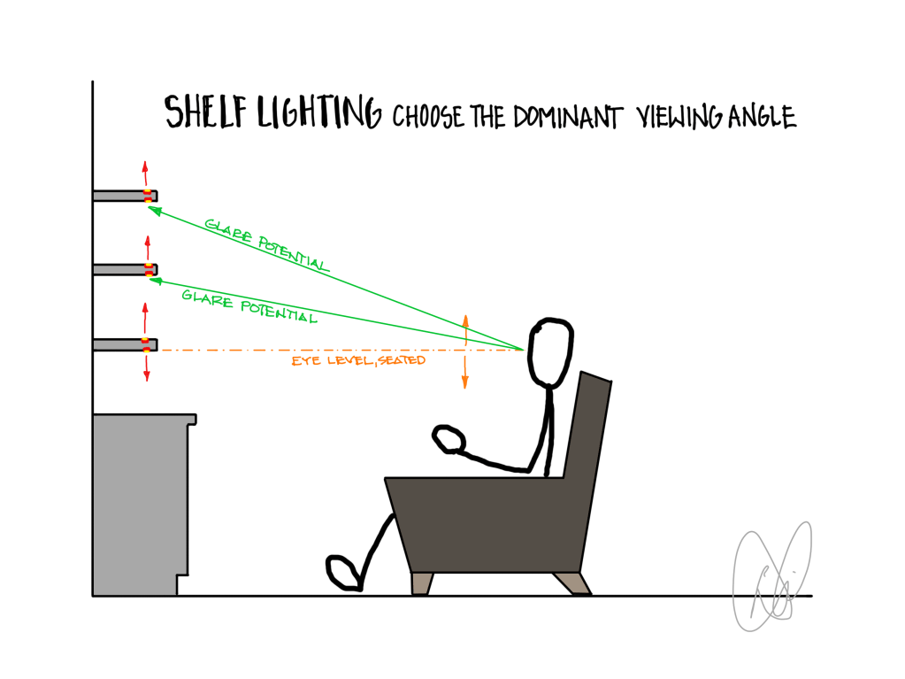 Let me show you why it matters. If I chose standing up as my primary viewing angle, I would recommend illuminating the shelves as illustrated above. Light sources above my viewing angle point upwards; sources below my eye level point downwards. This minimizes glare. See the green lines with Glare Potential labels? If I used the lights at the ends of those lines, I would be able to easily see them. To easily see them is to experience discomfort glare.