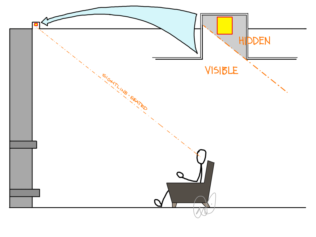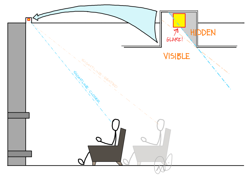 Given the placement of the couch in the illustration, the viewing angle or sightline of the seated individual can see into the slot a bit, but the edge blocks direct view of the fixture itself. This is ideal to minimize glare and maximize comfort.