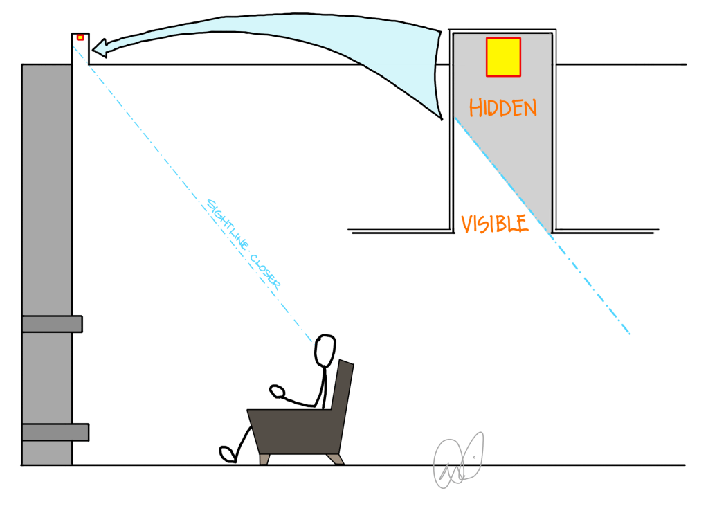 Basic geometry is the only aspect of math that makes intuitive sense to me, so I find this rather easy to do. To fix the problem, we can drag the couch further away from the fireplace – or we can build a deeper slot to conceal the source.