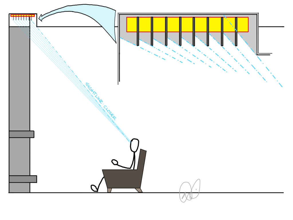 That means the slot is no longer adequate to conceal the fixture. In theatrical lighting design, one of my previous careers, we would carefully study sightlines to make sure fixtures were invisible to the seated audience. We should do the same in architecture.