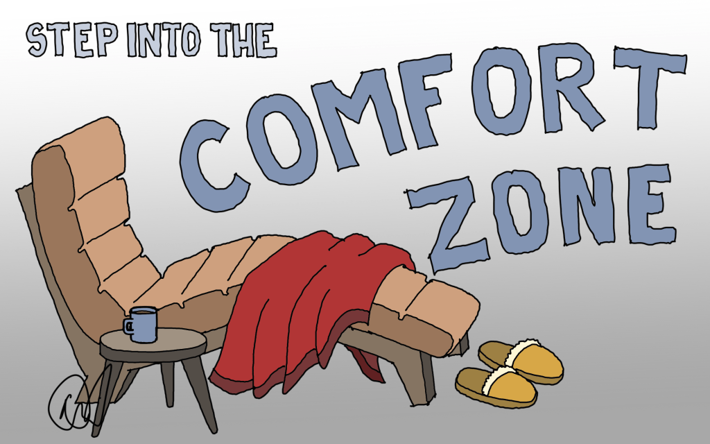 Take a moment to understand your Comfort Zone. Sit (or stand) in a comfortable position, with your body relaxed (but not drooping or asleep). Your head will likely direct your vision straight ahead. What do you see? If you turn your head slightly to your left, without stretching uncomfortably, what do you see? To the right? Our necks are flexible enough to allow us to look in all directions, but our comfort decreases the further we turn from straight on. Looking up at the ceiling will not be comfortable for long. Looking over our shoulder is momentarily at best.