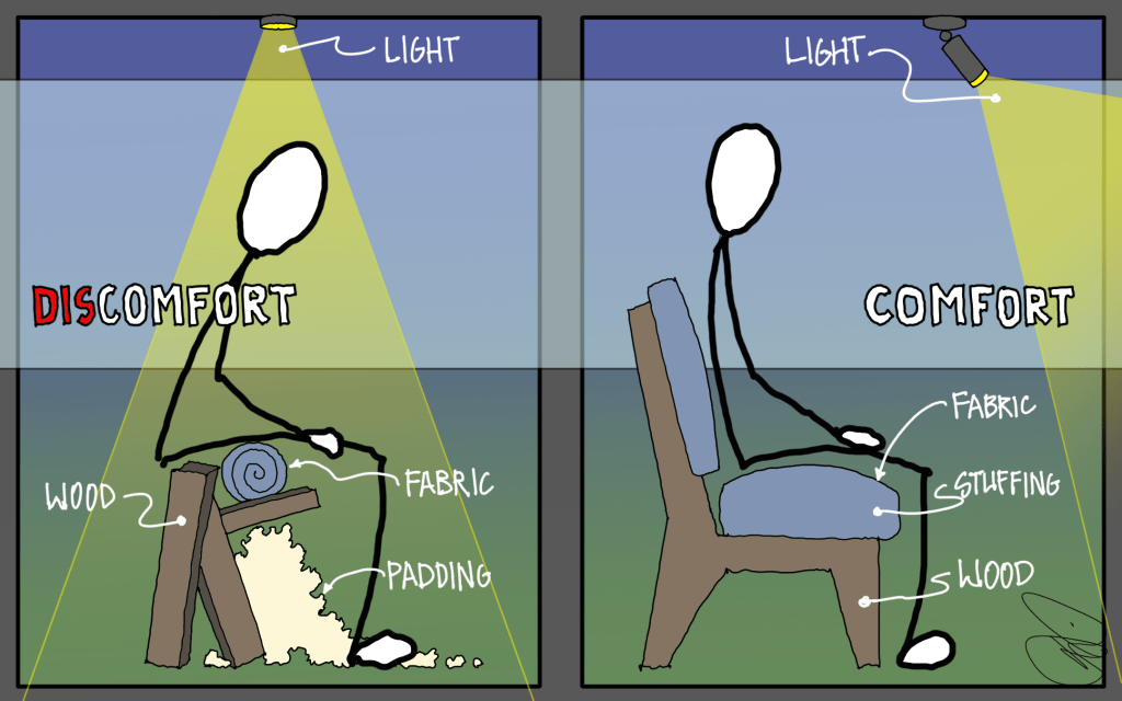 Take a look at the images above. On the left, we have someone seated on the “layers of light” version of a chair. It has all the “layers of comfort” necessary for a good chair: wood, padding, fabric. But when used without a plan, the seating arrangement is ludicrous at best and injurious at worst.