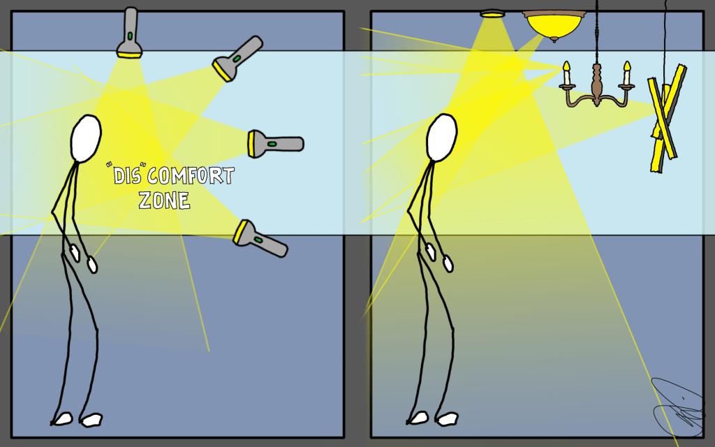 Our Comfort Zone is best when illuminated with comprehensive, adequate, softly reflected light, but this is rarely the case in both new homes and every era of existing houses. If I came over to your house every night, followed you around as you ate dinner, relaxed, and prepared for dinner, and made sure to keep a very bright flashlight pointed at your face, I doubt I would last a single evening before you called the authorities to have me evicted.
