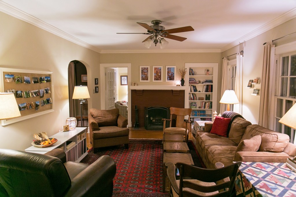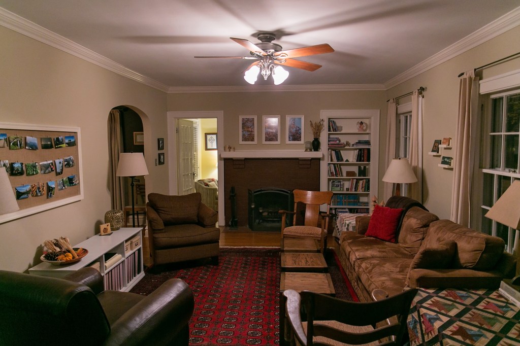 This is a picture from the modest living room of the house we owned awhile back. The Comfort Zone is filled with photographs, a triptych of images above the fireplace and the mantel itself, a bookshelf, curtains, and more. The only existing light in the room came from ceiling fan with classic light kit, essentially four light bulbs pointed right at your face. There is literally no comfortable seat in the room without blinding overhead light that leaves the Comfort Zone dim and stark.
